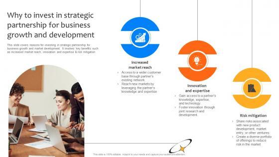 This slide covers reasons for investing in strategic partnership for business growth and market development. It involves key benefits such as increased market reach, innovation and expertise and risk mitigation. If your project calls for a presentation, then Slidegeeks is your go-to partner because we have professionally designed, easy-to-edit templates that are perfect for any presentation. After downloading, you can easily edit Brand Extension Techniques Why To Invest In Strategic Partnership For Business Growth Strategy SS V and make the changes accordingly. You can rearrange slides or fill them with different images. Check out all the handy templates This slide covers reasons for investing in strategic partnership for business growth and market development. It involves key benefits such as increased market reach, innovation and expertise and risk mitigation.