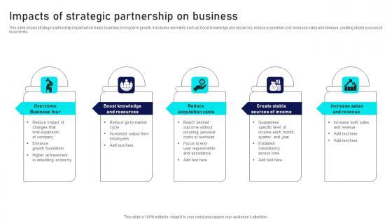 This slide shows strategic partnership impact which helps business in long term growth. It includes elements such as boost knowledge and resources, reduce acquisition cost, increase sales and revenue, creating stable sources of income etc. Pitch your topic with ease and precision using this Impacts Of Strategic Partnership On Business Portrait Pdf. This layout presents information on Overcome Business Fear, Reduce Acquisition Costs, Increase Sales And Revenue. It is also available for immediate download and adjustment. So, changes can be made in the color, design, graphics or any other component to create a unique layout. This slide shows strategic partnership impact which helps business in long term growth. It includes elements such as boost knowledge and resources, reduce acquisition cost, increase sales and revenue, creating stable sources of income etc.