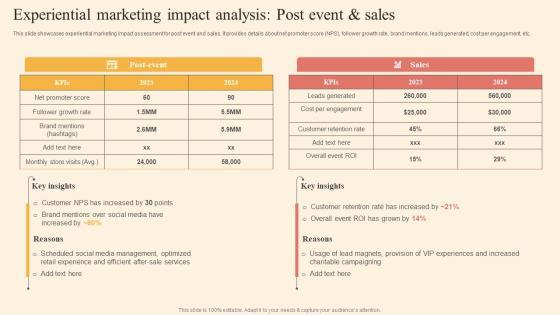 This slide showcases experiential marketing impact assessment for post event and sales. It provides details about net promoter score NPS, follower growth rate, brand mentions, leads generated, cost per engagement, etc. Welcome to our selection of the Experiential Marketing Impact Analysis Driving Business Success By Hosting Experiential Pictures Pdf. These are designed to help you showcase your creativity and bring your sphere to life. Planning and Innovation are essential for any business that is just starting out. This collection contains the designs that you need for your everyday presentations. All of our PowerPoints are 100 percent editable, so you can customize them to suit your needs. This multi purpose template can be used in various situations. Grab these presentation templates today This slide showcases experiential marketing impact assessment for post event and sales. It provides details about net promoter score NPS, follower growth rate, brand mentions, leads generated, cost per engagement, etc.