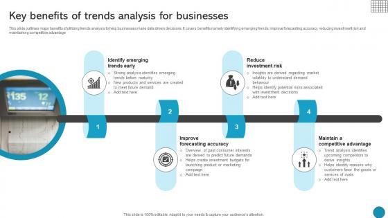 This slide outlines major benefits of utilizing trends analysis to help businesses make data driven decisions. It covers benefits namely identifying emerging trends, improve forecasting accuracy, reducing investment risk and maintaining competitive advantage Do you know about Slidesgeeks Key Benefits Of Trends Analysis For Businesses Driving Business Success Integrating Product These are perfect for delivering any kind od presentation. Using it, create PowerPoint presentations that communicate your ideas and engage audiences. Save time and effort by using our pre-designed presentation templates that are perfect for a wide range of topic. Our vast selection of designs covers a range of styles, from creative to business, and are all highly customizable and easy to edit. Download as a PowerPoint template or use them as Google Slides themes. This slide outlines major benefits of utilizing trends analysis to help businesses make data driven decisions. It covers benefits namely identifying emerging trends, improve forecasting accuracy, reducing investment risk and maintaining competitive advantage