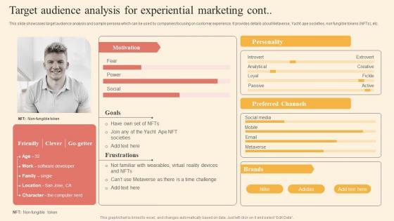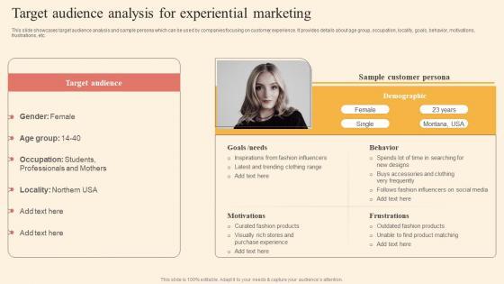 This slide showcases target audience analysis and sample persona which can be used by companies focusing on customer experience. It provides details about age group, occupation, locality, goals, behavior, motivations, frustrations, etc. The Target Audience Analysis Driving Business Success By Hosting Experiential Diagrams Pdf is a compilation of the most recent design trends as a series of slides. It is suitable for any subject or industry presentation, containing attractive visuals and photo spots for businesses to clearly express their messages. This template contains a variety of slides for the user to input data, such as structures to contrast two elements, bullet points, and slides for written information. Slidegeeks is prepared to create an impression. This slide showcases target audience analysis and sample persona which can be used by companies focusing on customer experience. It provides details about age group, occupation, locality, goals, behavior, motivations, frustrations, etc.