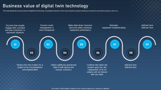 This slide depicts the business value of digital twin technology, including the behavior of the users towards a product, working of a product in real world scenarios, and so on. The best PPT templates are a great way to save time, energy, and resources. Slidegeeks have 100 percent editable powerpoint slides making them incredibly versatile. With these quality presentation templates, you can create a captivating and memorable presentation by combining visually appealing slides and effectively communicating your message. Download Business Value Of Digital Twin Technology Ppt PowerPoint Presentation File Example PDF from Slidegeeks and deliver a wonderful presentation.