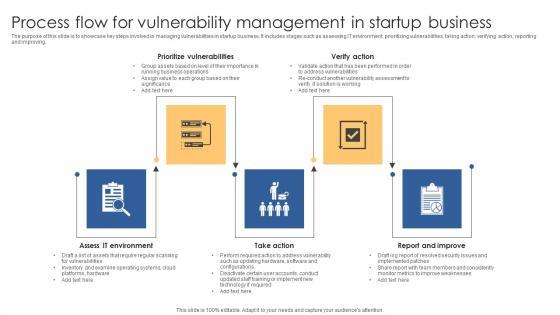 The purpose of this slide is to showcase key steps involved in managing vulnerabilities in startup business. It includes stages such as assessing IT environment, prioritizing vulnerabilities, taking action, verifying action, reporting and improving. Pitch your topic with ease and precision using this Process Flow For Vulnerability Management In Startup Business Background Pdf. This layout presents information on Prioritize Vulnerabilities, Verify Action, Take Action. It is also available for immediate download and adjustment. So, changes can be made in the color, design, graphics or any other component to create a unique layout. The purpose of this slide is to showcase key steps involved in managing vulnerabilities in startup business. It includes stages such as assessing IT environment, prioritizing vulnerabilities, taking action, verifying action, reporting and improving.