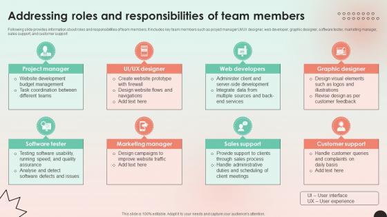 Following slide provides information about roles and responsibilities of team members. It includes key team members such as project manager UI or UX designer, web developer, graphic designer, software tester, marketing manager, sales support, and customer support. Do you have to make sure that everyone on your team knows about any specific topic I yes, then you should give Web Consulting Business Addressing Roles And Responsibilities Of Team Members a try. Our experts have put a lot of knowledge and effort into creating this impeccable Web Consulting Business Addressing Roles And Responsibilities Of Team Members. You can use this template for your upcoming presentations, as the slides are perfect to represent even the tiniest detail. You can download these templates from the Slidegeeks website and these are easy to edit. So grab these today Following slide provides information about roles and responsibilities of team members. It includes key team members such as project manager UI or UX designer, web developer, graphic designer, software tester, marketing manager, sales support, and customer support.