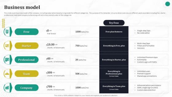 This slide covers business model of the company including subscription based pricing model for different categories . The purpose of this template is to provide an overview on different packs available including free, starter, professional, team and company suites along with activities covered under all the categories. Boost your pitch with our creative Business Model Automated Workflow Software Funding Pitch Deck For Company. Deliver an awe-inspiring pitch that will mesmerize everyone. Using these presentation templates you will surely catch everyones attention. You can browse the ppts collection on our website. We have researchers who are experts at creating the right content for the templates. So you do not have to invest time in any additional work. Just grab the template now and use them. This slide covers business model of the company including subscription based pricing model for different categories . The purpose of this template is to provide an overview on different packs available including free, starter, professional, team and company suites along with activities covered under all the categories.