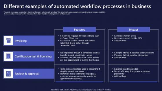 This slide showcases cases where digital workflows are opted in daily activities. This template focuses on saving time and money to increase visibility decrease redundancies of work. It includes information related to invoicing, review, certification, etc.Showcasing this set of slides titled Different Examples Of Automated Workflow Processes In Business Themes Pdf The topics addressed in these templates are Certification Test Licensing, Review Approval, Reviewers Leave Comments All the content presented in this PPT design is completely editable. Download it and make adjustments in color, background, font etc. as per your unique business setting. This slide showcases cases where digital workflows are opted in daily activities. This template focuses on saving time and money to increase visibility decrease redundancies of work. It includes information related to invoicing, review, certification, etc.