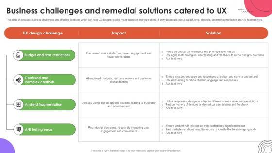 Do you have to make sure that everyone on your team knows about any specific topic I yes, then you should give Business Challenges And User Experience Design Ppt PowerPoint Strategy SS V a try. Our experts have put a lot of knowledge and effort into creating this impeccable Business Challenges And User Experience Design Ppt PowerPoint Strategy SS V. You can use this template for your upcoming presentations, as the slides are perfect to represent even the tiniest detail. You can download these templates from the Slidegeeks website and these are easy to edit. So grab these today Our Business Challenges And User Experience Design Ppt PowerPoint Strategy SS V are topically designed to provide an attractive backdrop to any subject. Use them to look like a presentation pro.