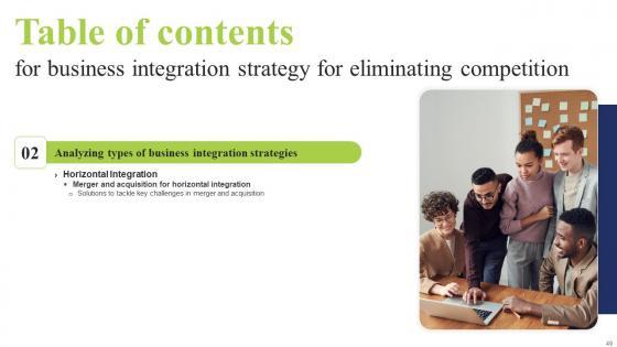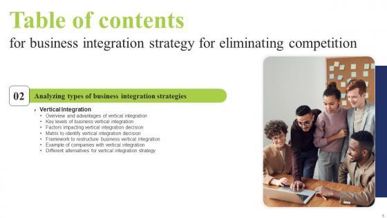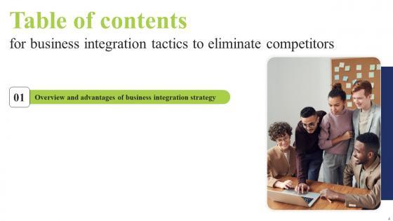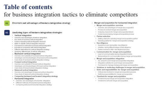 Whether you have daily or monthly meetings, a brilliant presentation is necessary. Table Of Contents For Business Integration Tactics To Eliminate Competitors Microsoft Pdf can be your best option for delivering a presentation. Represent everything in detail using Table Of Contents For Business Integration Tactics To Eliminate Competitors Microsoft Pdf and make yourself stand out in meetings. The template is versatile and follows a structure that will cater to your requirements. All the templates prepared by Slidegeeks are easy to download and edit. Our research experts have taken care of the corporate themes as well. So, give it a try and see the results. Our Table Of Contents For Business Integration Tactics To Eliminate Competitors Microsoft Pdf are topically designed to provide an attractive backdrop to any subject. Use them to look like a presentation pro.