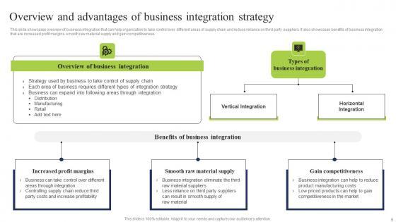 This slide showcases overview of business integration that can help organization to take control over different areas of supply chain and reduce reliance on third party suppliers. It also showcases benefits of business integration that are increased profit margins, smooth raw material supply and gain competitiveness Are you in need of a template that can accommodate all of your creative concepts This one is crafted professionally and can be altered to fit any style. Use it with Google Slides or PowerPoint. Include striking photographs, symbols, depictions, and other visuals. Fill, move around, or remove text boxes as desired. Test out color palettes and font mixtures. Edit and save your work, or work with colleagues. Download Business Integration Tactics To Eliminate Competitors Overview Advantages Business Information Pdf and observe how to make your presentation outstanding. Give an impeccable presentation to your group and make your presentation unforgettable. This slide showcases overview of business integration that can help organization to take control over different areas of supply chain and reduce reliance on third party suppliers. It also showcases benefits of business integration that are increased profit margins, smooth raw material supply and gain competitiveness
