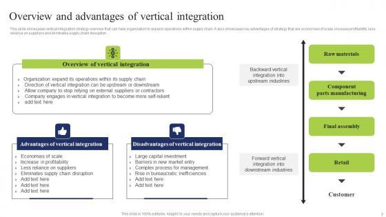 This slide showcases vertical integration strategy overview that can help organization to expand operations within supply chain. It also showcases key advantages of strategy that are economies of scale, increase profitability, less reliance on suppliers and eliminates supply chain disruption Slidegeeks is one of the best resources for PowerPoint templates. You can download easily and regulate Overview Advantages Vertical Business Integration Tactics To Eliminate Competitors Themes Pdf for your personal presentations from our wonderful collection. A few clicks is all it takes to discover and get the most relevant and appropriate templates. Use our Templates to add a unique zing and appeal to your presentation and meetings. All the slides are easy to edit and you can use them even for advertisement purposes. This slide showcases vertical integration strategy overview that can help organization to expand operations within supply chain. It also showcases key advantages of strategy that are economies of scale, increase profitability, less reliance on suppliers and eliminates supply chain disruption
