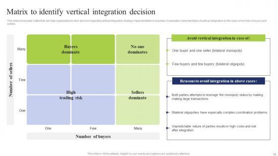 This slide showcases matrix that can help organization to take decision regarding vertical integration strategy implementation in business. It evaluates implementation of vertical integration on the basis of number of buyers and sellers Do you know about Slidesgeeks Matrix Identify Vertical Business Integration Tactics To Eliminate Competitors Diagrams Pdf These are perfect for delivering any kind od presentation. Using it, create PowerPoint presentations that communicate your ideas and engage audiences. Save time and effort by using our pre designed presentation templates that are perfect for a wide range of topic. Our vast selection of designs covers a range of styles, from creative to business, and are all highly customizable and easy to edit. Download as a PowerPoint template or use them as Google Slides themes. This slide showcases matrix that can help organization to take decision regarding vertical integration strategy implementation in business. It evaluates implementation of vertical integration on the basis of number of buyers and sellers