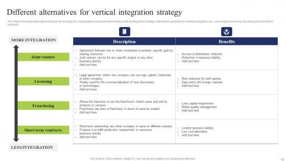 This slide showcases alternatives that can be leveraged by organization instead of implementing vertical integration strategy. Alternatives available for vertical integration are joint venture licensing, franchising and short term contracts The best PPT templates are a great way to save time, energy, and resources. Slidegeeks have 100 percent editable powerpoint slides making them incredibly versatile. With these quality presentation templates, you can create a captivating and memorable presentation by combining visually appealing slides and effectively communicating your message. Download Different Alternatives Vertical Business Integration Tactics To Eliminate Competitors Diagrams Pdf from Slidegeeks and deliver a wonderful presentation. This slide showcases alternatives that can be leveraged by organization instead of implementing vertical integration strategy. Alternatives available for vertical integration are joint venture licensing, franchising and short term contracts