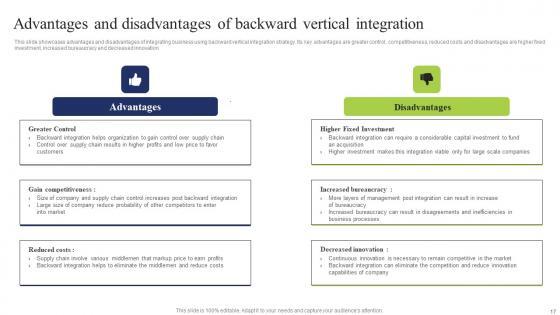 This slide showcases advantages and disadvantages of integrating business using backward vertical integration strategy. Its key advantages are greater control, competitiveness, reduced costs and disadvantages are higher fixed investment, increased bureaucracy and decreased innovation From laying roadmaps to briefing everything in detail, our templates are perfect for you. You can set the stage with your presentation slides. All you have to do is download these easy to edit and customizable templates. Advantages And Disadvantages Business Integration Tactics To Eliminate Competitors Structure Pdf will help you deliver an outstanding performance that everyone would remember and praise you for. Do download this presentation today. This slide showcases advantages and disadvantages of integrating business using backward vertical integration strategy. Its key advantages are greater control, competitiveness, reduced costs and disadvantages are higher fixed investment, increased bureaucracy and decreased innovation