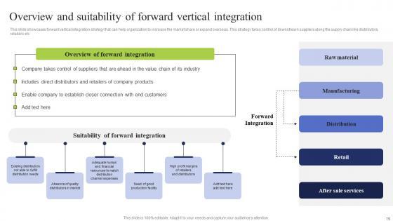 This slide showcases forward vertical integration strategy that can help organization to increase the market share or expand overseas. This strategy takes control of downstream suppliers along the supply chain like distributors, retailers etc There are so many reasons you need a Overview Suitability Forward Business Integration Tactics To Eliminate Competitors Diagrams Pdf. The first reason is you can not spend time making everything from scratch, Thus, Slidegeeks has made presentation templates for you too. You can easily download these templates from our website easily. This slide showcases forward vertical integration strategy that can help organization to increase the market share or expand overseas. This strategy takes control of downstream suppliers along the supply chain like distributors, retailers etc