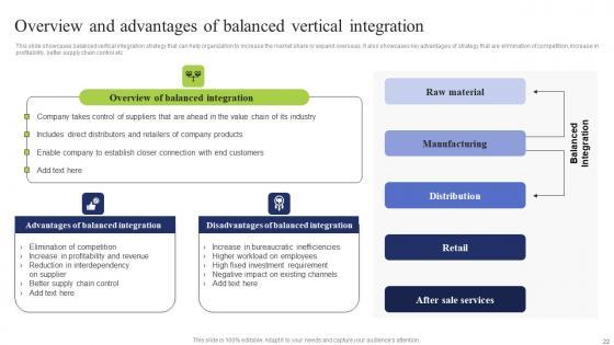This slide showcases balanced vertical integration strategy that can help organization to increase the market share or expand overseas. It also showcases key advantages of strategy that are elimination of competition, increase in profitability, better supply chain control etc Find a pre designed and impeccable Overview Advantages Balanced Business Integration Tactics To Eliminate Competitors Pictures Pdf. The templates can ace your presentation without additional effort. You can download these easy to edit presentation templates to make your presentation stand out from others. So, what are you waiting for Download the template from Slidegeeks today and give a unique touch to your presentation. This slide showcases balanced vertical integration strategy that can help organization to increase the market share or expand overseas. It also showcases key advantages of strategy that are elimination of competition, increase in profitability, better supply chain control etc