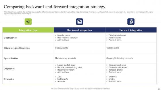 This slide showcases table that can help to evaluate the difference between backward and forward vertical integration strategy. It compares two types of integration on parameters like control over, eliminates profit margins, specialization, objectives and examples Coming up with a presentation necessitates that the majority of the effort goes into the content and the message you intend to convey. The visuals of a PowerPoint presentation can only be effective if it supplements and supports the story that is being told. Keeping this in mind our experts created Comparing Backward Forward Business Integration Tactics To Eliminate Competitors Structure Pdf to reduce the time that goes into designing the presentation. This way, you can concentrate on the message while our designers take care of providing you with the right template for the situation. This slide showcases table that can help to evaluate the difference between backward and forward vertical integration strategy. It compares two types of integration on parameters like control over, eliminates profit margins, specialization, objectives and examples