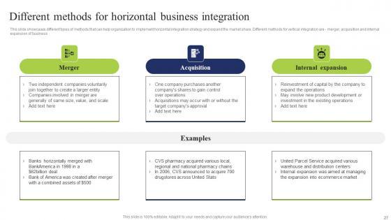 This slide showcases different types of methods that can help organization to implement horizontal integration strategy and expand the market share. Different methods for vertical integration are merger, acquisition and internal expansion of business The Different Methods Horizontal Business Integration Tactics To Eliminate Competitors Microsoft Pdf is a compilation of the most recent design trends as a series of slides. It is suitable for any subject or industry presentation, containing attractive visuals and photo spots for businesses to clearly express their messages. This template contains a variety of slides for the user to input data, such as structures to contrast two elements, bullet points, and slides for written information. Slidegeeks is prepared to create an impression. This slide showcases different types of methods that can help organization to implement horizontal integration strategy and expand the market share. Different methods for vertical integration are merger, acquisition and internal expansion of business