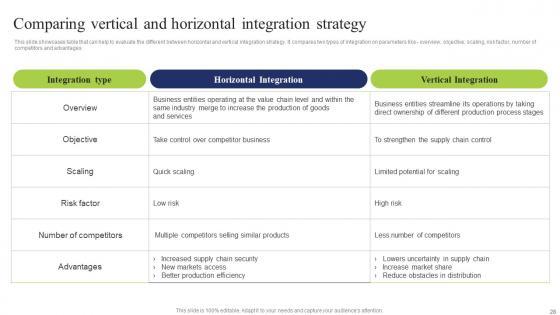 This slide showcases table that can help to evaluate the different between horizontal and vertical integration strategy. It compares two types of integration on parameters like overview, objective, scaling, risk factor, number of competitors and advantages This modern and well arranged Comparing Vertical Horizontal Business Integration Tactics To Eliminate Competitors Formats Pdf provides lots of creative possibilities. It is very simple to customize and edit with the Powerpoint Software. Just drag and drop your pictures into the shapes. All facets of this template can be edited with Powerpoint, no extra software is necessary. Add your own material, put your images in the places assigned for them, adjust the colors, and then you can show your slides to the world, with an animated slide included. This slide showcases table that can help to evaluate the different between horizontal and vertical integration strategy. It compares two types of integration on parameters like overview, objective, scaling, risk factor, number of competitors and advantages