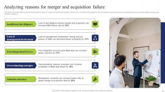 This slide showcases different reasons that results in failure of merger and acquisition strategy. Reasons are insufficient due diligence, lack of management involvement, poor integration process, overestimating synergies and valuation mistakes Whether you have daily or monthly meetings, a brilliant presentation is necessary. Analyzing Reasons Merger Business Integration Tactics To Eliminate Competitors Ideas Pdf can be your best option for delivering a presentation. Represent everything in detail using Analyzing Reasons Merger Business Integration Tactics To Eliminate Competitors Ideas Pdf and make yourself stand out in meetings. The template is versatile and follows a structure that will cater to your requirements. All the templates prepared by Slidegeeks are easy to download and edit. Our research experts have taken care of the corporate themes as well. So, give it a try and see the results. This slide showcases different reasons that results in failure of merger and acquisition strategy. Reasons are insufficient due diligence, lack of management involvement, poor integration process, overestimating synergies and valuation mistakes