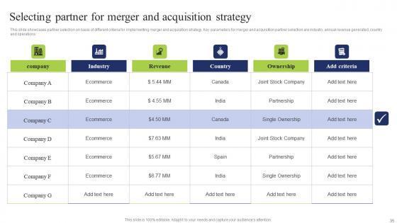 This slide showcases partner selection on basis of different criteria for implementing merger and acquisition strategy. Key parameters for merger and acquisition partner selection are industry, annual revenue generated, country and operations Present like a pro with Selecting Partner Merger Business Integration Tactics To Eliminate Competitors Summary Pdf Create beautiful presentations together with your team, using our easy to use presentation slides. Share your ideas in real time and make changes on the fly by downloading our templates. So whether you are in the office, on the go, or in a remote location, you can stay in sync with your team and present your ideas with confidence. With Slidegeeks presentation got a whole lot easier. Grab these presentations today. This slide showcases partner selection on basis of different criteria for implementing merger and acquisition strategy. Key parameters for merger and acquisition partner selection are industry, annual revenue generated, country and operations