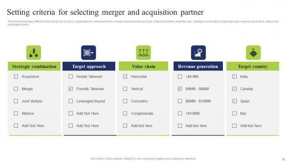 This slide showcases different criteria that can be set by organization to select partner for merger and acquisition process. Criteria for partner selection are strategic combination, target approach, revenue generation, value chain and target country Slidegeeks is here to make your presentations a breeze with Setting Criteria Selecting Merger Business Integration Tactics Eliminate Competitors Professional Pdf With our easy to use and customizable templates, you can focus on delivering your ideas rather than worrying about formatting. With a variety of designs to choose from, you are sure to find one that suits your needs. And with animations and unique photos, illustrations, and fonts, you can make your presentation pop. So whether you are giving a sales pitch or presenting to the board, make sure to check out Slidegeeks first This slide showcases different criteria that can be set by organization to select partner for merger and acquisition process. Criteria for partner selection are strategic combination, target approach, revenue generation, value chain and target country