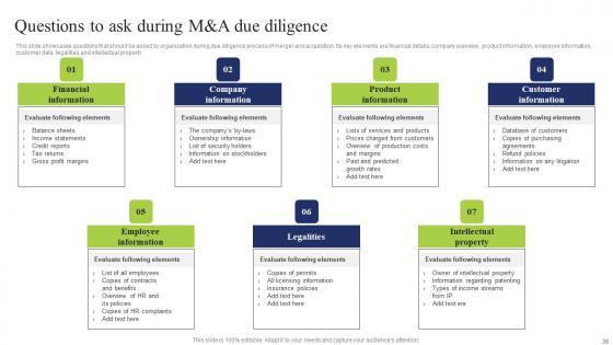 This slide showcases questions that should be asked by organization during due diligence process of merger and acquisition. Its key elements are financial details, company overview, product information, employee information, customer data, legalities and intellectual property From laying roadmaps to briefing everything in detail, our templates are perfect for you. You can set the stage with your presentation slides. All you have to do is download these easy to edit and customizable templates. Questions Ask During M A Due Business Integration Tactics To Eliminate Competitors Clipart Pdf will help you deliver an outstanding performance that everyone would remember and praise you for. Do download this presentation today. This slide showcases questions that should be asked by organization during due diligence process of merger and acquisition. Its key elements are financial details, company overview, product information, employee information, customer data, legalities and intellectual property