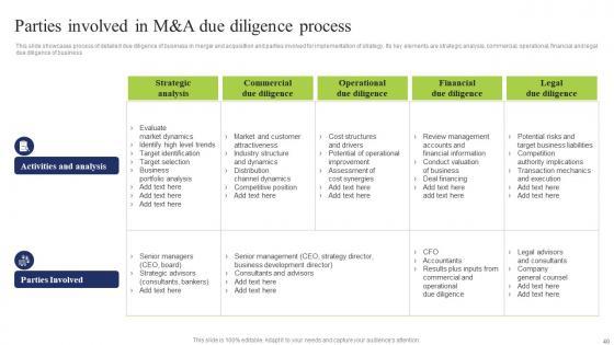 This slide showcases process of detailed due diligence of business in merger and acquisition and parties involved for implementation of strategy. Its key elements are strategic analysis, commercial, operational, financial and legal due diligence of business Do you have to make sure that everyone on your team knows about any specific topic I yes, then you should give Parties Involved M A Due Business Integration Tactics To Eliminate Competitors Guidelines Pdf a try. Our experts have put a lot of knowledge and effort into creating this impeccable Parties Involved M A Due Business Integration Tactics To Eliminate Competitors Guidelines Pdf. You can use this template for your upcoming presentations, as the slides are perfect to represent even the tiniest detail. You can download these templates from the Slidegeeks website and these are easy to edit. So grab these today This slide showcases process of detailed due diligence of business in merger and acquisition and parties involved for implementation of strategy. Its key elements are strategic analysis, commercial, operational, financial and legal due diligence of business