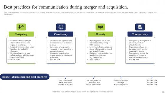 This slide showcases best practices that should be adopted by organization to increase the effectiveness and success probability of merger and acquisition process. Its key elements are frequency, consistency, honesty and transparency Find highly impressive Best Practices For Communication Business Integration Tactics To Eliminate Competitors Demonstration Pdf on Slidegeeks to deliver a meaningful presentation. You can save an ample amount of time using these presentation templates. No need to worry to prepare everything from scratch because Slidegeeks experts have already done a huge research and work for you. You need to download Best Practices For Communication Business Integration Tactics To Eliminate Competitors Demonstration Pdf for your upcoming presentation. All the presentation templates are 100 percent editable and you can change the color and personalize the content accordingly. Download now This slide showcases best practices that should be adopted by organization to increase the effectiveness and success probability of merger and acquisition process. Its key elements are frequency, consistency, honesty and transparency