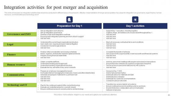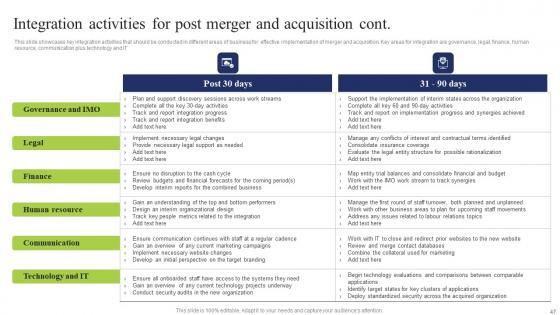 This slide showcases key integration activities that should be conducted in different areas of business for effective implementation of merger and acquisition. Key areas for integration are governance, legal, finance, human resource, communication plus technology and IT Presenting this PowerPoint presentation, titled Integration Activities Post Business Integration Tactics To Eliminate Competitors Introduction Pdf, with topics curated by our researchers after extensive research. This editable presentation is available for immediate download and provides attractive features when used. Download now and captivate your audience. Presenting this Integration Activities Post Business Integration Tactics To Eliminate Competitors Introduction Pdf. Our researchers have carefully researched and created these slides with all aspects taken into consideration. This is a completely customizable Integration Activities Post Business Integration Tactics To Eliminate Competitors Introduction Pdf that is available for immediate downloading. Download now and make an impact on your audience. Highlight the attractive features available with our PPTs. This slide showcases key integration activities that should be conducted in different areas of business for effective implementation of merger and acquisition. Key areas for integration are governance, legal, finance, human resource, communication plus technology and IT