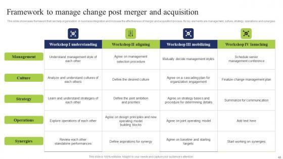 This slide showcases framework that can help organization in business integration and increase the effectiveness of merger and acquisition process. Its key elements are management, culture, strategy, operations and synergies Slidegeeks has constructed Framework To Manage Change Business Integration Tactics To Eliminate Competitors Graphics Pdf after conducting extensive research and examination. These presentation templates are constantly being generated and modified based on user preferences and critiques from editors. Here, you will find the most attractive templates for a range of purposes while taking into account ratings and remarks from users regarding the content. This is an excellent jumping off point to explore our content and will give new users an insight into our top notch PowerPoint Templates. This slide showcases framework that can help organization in business integration and increase the effectiveness of merger and acquisition process. Its key elements are management, culture, strategy, operations and synergies