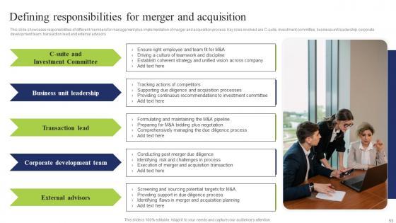 This slide showcases responsibilities of different members for management plus implementation of merger and acquisition process. Key roles involved are C suite, investment committee, business unit leadership, corporate development team, transaction lead and external advisors Explore a selection of the finest Defining Responsibilities Merger Business Integration Tactics To Eliminate Competitors Sample Pdf here. With a plethora of professionally designed and pre made slide templates, you can quickly and easily find the right one for your upcoming presentation. You can use our Defining Responsibilities Merger Business Integration Tactics To Eliminate Competitors Sample Pdf to effectively convey your message to a wider audience. Slidegeeks has done a lot of research before preparing these presentation templates. The content can be personalized and the slides are highly editable. Grab templates today from Slidegeeks. This slide showcases responsibilities of different members for management plus implementation of merger and acquisition process. Key roles involved are C suite, investment committee, business unit leadership, corporate development team, transaction lead and external advisors