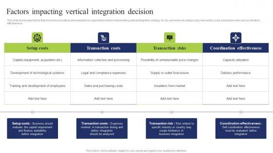 This slide showcases factors that should be considered and evaluated by organization before implementing vertical integration strategy. Its key elements are setups costs, transaction costs, transaction risks and coordination effectiveness Retrieve professionally designed Factors Impacting Vertical Business Integration Tactics To Eliminate Competitors Infographics Pdf to effectively convey your message and captivate your listeners. Save time by selecting pre made slideshows that are appropriate for various topics, from business to educational purposes. These themes come in many different styles, from creative to corporate, and all of them are easily adjustable and can be edited quickly. Access them as PowerPoint templates or as Google Slides themes. You do not have to go on a hunt for the perfect presentation because Slidegeeks got you covered from everywhere. This slide showcases factors that should be considered and evaluated by organization before implementing vertical integration strategy. Its key elements are setups costs, transaction costs, transaction risks and coordination effectiveness
