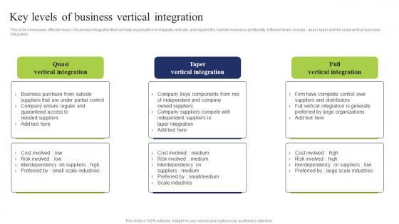 This slide showcases different levels of business integration that can help organization to integrate vertically and expand the market share plus profitability. Different levels include quasi, taper and full scale vertical business integration This Key Levels Business Vertical Business Integration Tactics To Eliminate Competitors Microsoft Pdf from Slidegeeks makes it easy to present information on your topic with precision. It provides customization options, so you can make changes to the colors, design, graphics, or any other component to create a unique layout. It is also available for immediate download, so you can begin using it right away. Slidegeeks has done good research to ensure that you have everything you need to make your presentation stand out. Make a name out there for a brilliant performance. This slide showcases different levels of business integration that can help organization to integrate vertically and expand the market share plus profitability. Different levels include quasi, taper and full scale vertical business integration