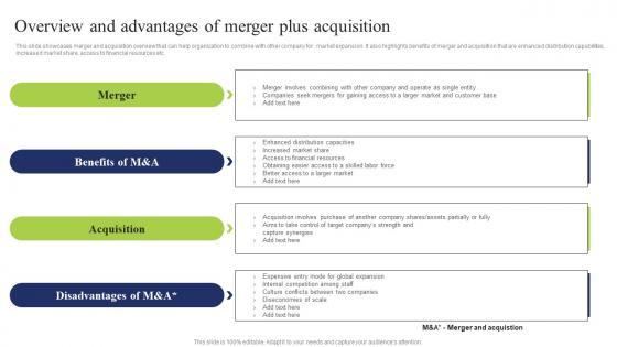 This slide showcases merger and acquisition overview that can help organization to combine with other company for market expansion. It also highlights benefits of merger and acquisition that are enhanced distribution capabilities, increased market share, access to financial resources etc Create an editable Overview Advantages Merger Business Integration Tactics To Eliminate Competitors Structure Pdf that communicates your idea and engages your audience. Whether you are presenting a business or an educational presentation, pre designed presentation templates help save time. Overview Advantages Merger Business Integration Tactics To Eliminate Competitors Structure Pdf is highly customizable and very easy to edit, covering many different styles from creative to business presentations. Slidegeeks has creative team members who have crafted amazing templates. So, go and get them without any delay. This slide showcases merger and acquisition overview that can help organization to combine with other company for market expansion. It also highlights benefits of merger and acquisition that are enhanced distribution capabilities, increased market share, access to financial resources etc