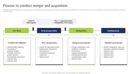 This slide showcases steps that can help organization to implement merger and acquisition to increase market share plus profitability. Key steps involved in merger and acquisition are pre deal, deal preparation, integration and optimization Get a simple yet stunning designed Process To Conduct Merger Business Integration Tactics To Eliminate Competitors Information Pdf. It is the best one to establish the tone in your meetings. It is an excellent way to make your presentations highly effective. So, download this PPT today from Slidegeeks and see the positive impacts. Our easy to edit Process To Conduct Merger Business Integration Tactics To Eliminate Competitors Information Pdf can be your go to option for all upcoming conferences and meetings. So, what are you waiting for Grab this template today. This slide showcases steps that can help organization to implement merger and acquisition to increase market share plus profitability. Key steps involved in merger and acquisition are pre deal, deal preparation, integration and optimization