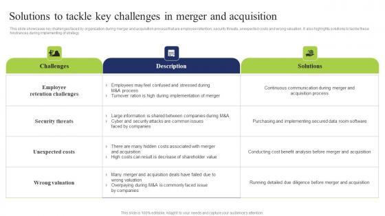 This slide showcases key challenges faced by organization during merger and acquisition process that are employee retention, security threats, unexpected costs and wrong valuation. It also highlights solutions to tackle these hindrances during implementing of strategy Do you have an important presentation coming up Are you looking for something that will make your presentation stand out from the rest Look no further than Solutions Tackle Key Challenges Business Integration Tactics To Eliminate Competitors Elements Pdf. With our professional designs, you can trust that your presentation will pop and make delivering it a smooth process. And with Slidegeeks, you can trust that your presentation will be unique and memorable. So why wait Grab Solutions Tackle Key Challenges Business Integration Tactics To Eliminate Competitors Elements Pdf today and make your presentation stand out from the rest This slide showcases key challenges faced by organization during merger and acquisition process that are employee retention, security threats, unexpected costs and wrong valuation. It also highlights solutions to tackle these hindrances during implementing of strategy