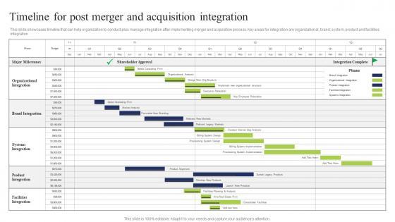 This slide showcases timeline that can help organization to conduct plus manage integration after implementing merger and acquisition process. Key areas for integration are organizational, brand, system, product and facilities integration Find highly impressive Timeline Post Merger Business Integration Tactics To Eliminate Competitors Graphics Pdf on Slidegeeks to deliver a meaningful presentation. You can save an ample amount of time using these presentation templates. No need to worry to prepare everything from scratch because Slidegeeks experts have already done a huge research and work for you. You need to download Timeline Post Merger Business Integration Tactics To Eliminate Competitors Graphics Pdf for your upcoming presentation. All the presentation templates are 100 percent editable and you can change the color and personalize the content accordingly. Download now This slide showcases timeline that can help organization to conduct plus manage integration after implementing merger and acquisition process. Key areas for integration are organizational, brand, system, product and facilities integration