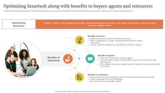 The slide outlines aligning and implementing insurance and technology to make insurance more assessible for customers. It also highlights various benefits provided by Insurtech to buyers, agents and reinsurers. From laying roadmaps to briefing everything in detail, our templates are perfect for you. You can set the stage with your presentation slides. All you have to do is download these easy-to-edit and customizable templates. Improving Customer Satisfaction Optimizing Insurtech Along With Benefits To Buyers Agents will help you deliver an outstanding performance that everyone would remember and praise you for. Do download this presentation today. The slide outlines aligning and implementing insurance and technology to make insurance more assessible for customers. It also highlights various benefits provided by Insurtech to buyers, agents and reinsurers.