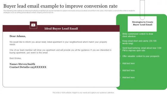 The following slide outlines an ideal lead nurturing email that can assist marketers to capture new leads and successfully convert them into sales. Information covered in this slide is related to strategies such as writing personalized content, keeping short email, etc. From laying roadmaps to briefing everything in detail, our templates are perfect for you. You can set the stage with your presentation slides. All you have to do is download these easy-to-edit and customizable templates. Buyer Lead Email Example To Improve Conversion Rate Out Of The Box Real Microsoft Pdf will help you deliver an outstanding performance that everyone would remember and praise you for. Do download this presentation today. The following slide outlines an ideal lead nurturing email that can assist marketers to capture new leads and successfully convert them into sales. Information covered in this slide is related to strategies such as writing personalized content, keeping short email, etc.
