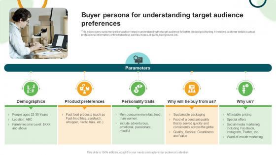 This slide covers customer persona which helps in understanding the target audience for better product positioning. It includes customer details such as professional information, online behaviour, worries, hopes, dreams, background, etc. Whether you have daily or monthly meetings, a brilliant presentation is necessary. Types And Examples Of Product Buyer Persona For Understanding Target Audience Preferences can be your best option for delivering a presentation. Represent everything in detail using Types And Examples Of Product Buyer Persona For Understanding Target Audience Preferences and make yourself stand out in meetings. The template is versatile and follows a structure that will cater to your requirements. All the templates prepared by Slidegeeks are easy to download and edit. Our research experts have taken care of the corporate themes as well. So, give it a try and see the results. This slide covers customer persona which helps in understanding the target audience for better product positioning. It includes customer details such as professional information, online behaviour, worries, hopes, dreams, background, etc.