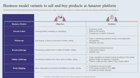 This slide provides information regarding business model variants utilized at Amazon platform to sell and buy products. Key variants include private label, wholesale, retail arbitrage, drop shipping, etc. From laying roadmaps to briefing everything in detail, our templates are perfect for you. You can set the stage with your presentation slides. All you have to do is download these easy-to-edit and customizable templates. Business Model Variants To Sell And Buy Products At Amazons Journey For Becoming Elements PDF will help you deliver an outstanding performance that everyone would remember and praise you for. Do download this presentation today. This slide provides information regarding business model variants utilized at Amazon platform to sell and buy products. Key variants include private label, wholesale, retail arbitrage, drop shipping, etc.
