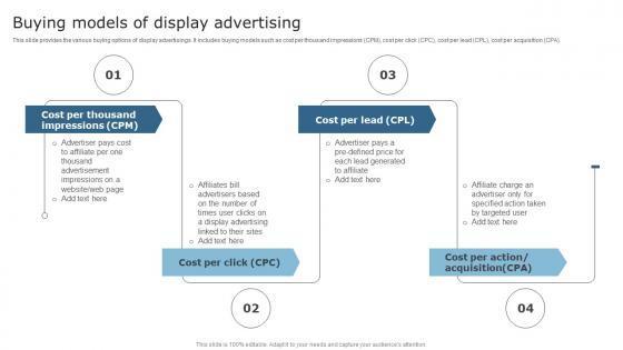 This slide provides the various buying options of display advertisings. It includes buying models such as cost per thousand impressions CPM, cost per click CPC, cost per lead CPL, cost per acquisition CPA. If your project calls for a presentation, then Slidegeeks is your go to partner because we have professionally designed, easy to edit templates that are perfect for any presentation. After downloading, you can easily edit Buying Models Of Display Advertising Slides PDF and make the changes accordingly. You can rearrange slides or fill them with different images. Check out all the handy templates
