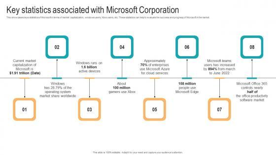 This showcases keys statistics of Microsoft in terms of market capitalization, windows users, Xbox users, etc. These statistics can help to evaluate the success and progress of Microsoft in the market. This Key Statistics Associated With Microsoft Strategic Advancements By Microsofts Mockup Pdf is perfect for any presentation, be it in front of clients or colleagues. It is a versatile and stylish solution for organizing your meetings. The Key Statistics Associated With Microsoft Strategic Advancements By Microsofts Mockup Pdf features a modern design for your presentation meetings. The adjustable and customizable slides provide unlimited possibilities for acing up your presentation. Slidegeeks has done all the homework before launching the product for you. So, do not wait, grab the presentation templates today This showcases keys statistics of Microsoft in terms of market capitalization, windows users, Xbox users, etc. These statistics can help to evaluate the success and progress of Microsoft in the market.