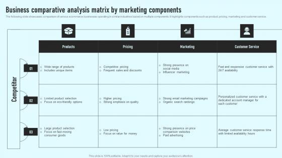 The following slide showcases comparison of various ecommerce businesses operating in similar industries based on multiple components. It highlights components such as product, pricing, marketing and customer service. Want to ace your presentation in front of a live audience Our Business Comparative Analysis Matrix By Marketing Components Comprehensive Guide Designs Pdf can help you do that by engaging all the users towards you. Slidegeeks experts have put their efforts and expertise into creating these impeccable powerpoint presentations so that you can communicate your ideas clearly. Moreover, all the templates are customizable, and easy-to-edit and downloadable. Use these for both personal and commercial use. The following slide showcases comparison of various ecommerce businesses operating in similar industries based on multiple components. It highlights components such as product, pricing, marketing and customer service.