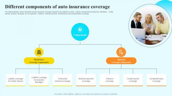 The slide illustrates various elements of auto insurance coverage required to be added to a policy. Various components included are mandatory bodily injuries, property damages, etc and optional collision, medical payment, underinsured and comprehensive coverage. Whether you have daily or monthly meetings, a brilliant presentation is necessary. Different Components Of Auto Steps By Step Guide For Claiming Car PPT Slide can be your best option for delivering a presentation. Represent everything in detail using Different Components Of Auto Steps By Step Guide For Claiming Car PPT Slide and make yourself stand out in meetings. The template is versatile and follows a structure that will cater to your requirements. All the templates prepared by Slidegeeks are easy to download and edit. Our research experts have taken care of the corporate themes as well. So, give it a try and see the results. The slide illustrates various elements of auto insurance coverage required to be added to a policy. Various components included are mandatory bodily injuries, property damages, etc and optional collision, medical payment, underinsured and comprehensive coverage.