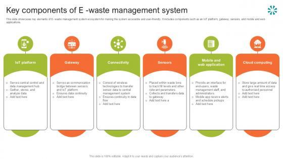This slide showcases key elements of E- waste management system ecosystem for making the system accessible and user-friendly. It includes components such as an IoT platform, gateway, sensors, and mobile and web applications. This modern and well-arranged Key Components Of E Waste Step By Step Guide For Electronic Ppt Presentation provides lots of creative possibilities. It is very simple to customize and edit with the Powerpoint Software. Just drag and drop your pictures into the shapes. All facets of this template can be edited with Powerpoint, no extra software is necessary. Add your own material, put your images in the places assigned for them, adjust the colors, and then you can show your slides to the world, with an animated slide included. This slide showcases key elements of E waste management system ecosystem for making the system accessible and user friendly. It includes components such as an IoT platform, gateway, sensors, and mobile and web applications.