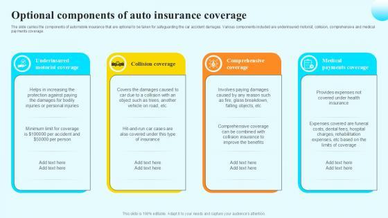 The slide carries the components of automobile insurance that are optional to be taken for safeguarding the car accident damages. Various components included are underinsured motorist, collision, comprehensive and medical payments coverage. Retrieve professionally designed Optional Components Of Auto Steps By Step Guide For Claiming Car PPT Template to effectively convey your message and captivate your listeners. Save time by selecting pre-made slideshows that are appropriate for various topics, from business to educational purposes. These themes come in many different styles, from creative to corporate, and all of them are easily adjustable and can be edited quickly. Access them as PowerPoint templates or as Google Slides themes. You do not have to go on a hunt for the perfect presentation because Slidegeeks got you covered from everywhere. The slide carries the components of automobile insurance that are optional to be taken for safeguarding the car accident damages. Various components included are underinsured motorist, collision, comprehensive and medical payments coverage.