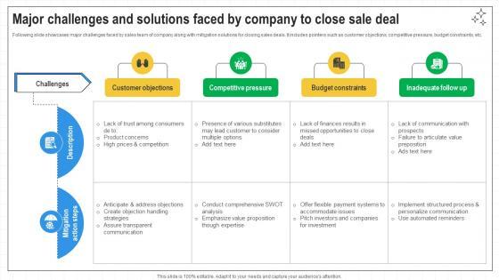 Following slide showcases major challenges faced by sales team of company along with mitigation solutions for closing sales deals. It includes pointers such as customer objections, competitive pressure, budget constraints, etc. This Closing Techniques To Seal Major Challenges And Solutions Faced By Company SA SS V is perfect for any presentation, be it in front of clients or colleagues. It is a versatile and stylish solution for organizing your meetings. The Closing Techniques To Seal Major Challenges And Solutions Faced By Company SA SS V features a modern design for your presentation meetings. The adjustable and customizable slides provide unlimited possibilities for acing up your presentation. Slidegeeks has done all the homework before launching the product for you. So, do not wait, grab the presentation templates today Following slide showcases major challenges faced by sales team of company along with mitigation solutions for closing sales deals. It includes pointers such as customer objections, competitive pressure, budget constraints, etc.