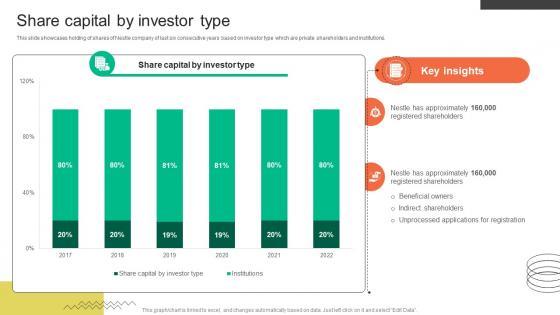 This slide showcases holding of shares of Nestle company of last six consecutive years based on investor type which are private shareholders and institutions. Here you can discover an assortment of the finest PowerPoint and Google Slides templates. With these templates, you can create presentations for a variety of purposes while simultaneously providing your audience with an eye-catching visual experience. Download Share Capital By Investor Type FMCG Provider Company Profile CP SS V to deliver an impeccable presentation. These templates will make your job of preparing presentations much quicker, yet still, maintain a high level of quality. Slidegeeks has experienced researchers who prepare these templates and write high-quality content for you. Later on, you can personalize the content by editing the Share Capital By Investor Type FMCG Provider Company Profile CP SS V. This slide showcases holding of shares of Nestle company of last six consecutive years based on investor type which are private shareholders and institutions.
