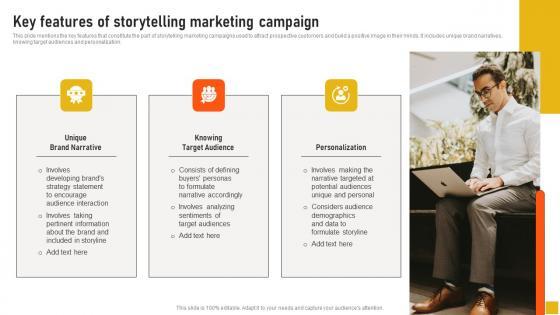 This slide mentions the key features that constitute the part of storytelling marketing campaigns used to attract prospective customers and build a positive image in their minds. It includes unique brand narratives, knowing target audiences and personalization. Slidegeeks is here to make your presentations a breeze with Key Features Of Storytelling Marketing Campaign Comprehensive Guide Inspiration Pdf With our easy-to-use and customizable templates, you can focus on delivering your ideas rather than worrying about formatting. With a variety of designs to choose from, you are sure to find one that suits your needs. And with animations and unique photos, illustrations, and fonts, you can make your presentation pop. So whether you are giving a sales pitch or presenting to the board, make sure to check out Slidegeeks first. This slide mentions the key features that constitute the part of storytelling marketing campaigns used to attract prospective customers and build a positive image in their minds. It includes unique brand narratives, knowing target audiences and personalization.